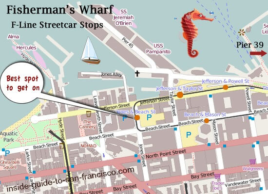 If you are coming in on BART, it's easy to get to Fisherman's Wharf. Get off at any of the stops along Market Street (Embarcadero stop would be the most efficient), come up to the surface of Market Street and find the nearest trolley (F-line streetcar) stop. There's a streetcar stop at Embarcadero.