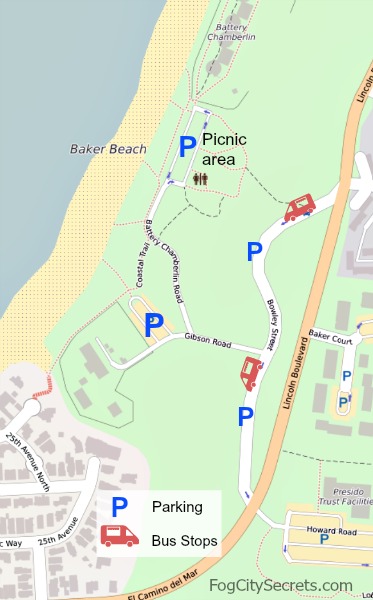 Driving directions. Take Bowley Street off Lincoln Blvd. in the Presidio. Turn right on Gibson Road, then right at the fork towards the beach.