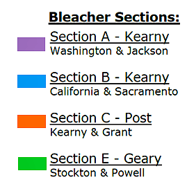 Sutter Street Stands, at GrantThis year, these seats will be on Post Street, instead of Sutter, but they should look about the same. See photo of Kearny Street stands above.